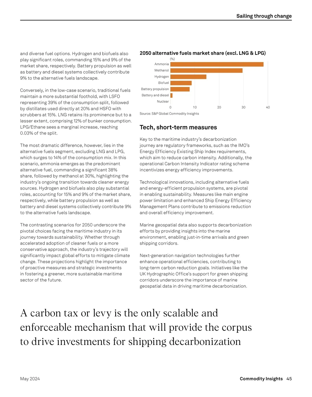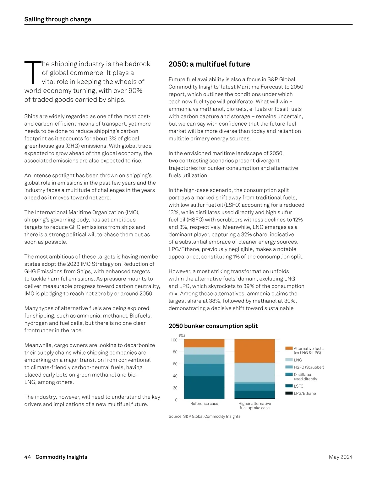 Sailing through change T he shipping industry is the bedrock of global commerce. It plays a vital role in keeping the wheels of world economy turning, with over 90% of traded goods carried by ships. 2050: a multifuel future Future fuel availability is also a focus in S&P Global Commodity Insights’ latest Maritime Forecast to 2050 report, which outlines the conditions under which each new fuel type will proliferate. What will win – ammonia vs methanol, biofuels, e-fuels or fossil fuels with carbon capture and storage – remains uncertain, but we can say with confidence that the future fuel market will be more diverse than today and reliant on multiple primary energy sources. In the envisioned maritime landscape of 2050, two contrasting scenarios present divergent trajectories for bunker consumption and alternative fuels utilization. In the high-case scenario, the consumption split portrays a marked shift away from traditional fuels, with low sulfur fuel oil (LSFO) accounting for a reduced 13%, while distillates used directly and high sulfur fuel oil (HSFO) with scrubbers witness declines to 12% and 3%, respectively. Meanwhile, LNG emerges as a dominant player, capturing a 32% share, indicative of a substantial embrace of cleaner energy sources. LPG/Ethane, previously negligible, makes a notable appearance, constituting 1% of the consumption split. However, a most striking transformation unfolds within the alternative fuels’ domain, excluding LNG and LPG, which skyrockets to 39% of the consumption mix. Among these alternatives, ammonia claims the largest share at 38%, followed by methanol at 30%, demonstrating a decisive shift toward sustainable Ships are widely regarded as one of the most cost-and carbon-efficient means of transport, yet more needs to be done to reduce shipping’s carbon footprint as it accounts for about 3% of global greenhouse gas (GHG) emissions. With global trade expected to grow ahead of the global economy, the associated emissions are also expected to rise. An intense spotlight has been thrown on shipping’s global role in emissions in the past few years and the industry faces a multitude of challenges in the years ahead as it moves toward net zero. The International Maritime Organization (IMO), shipping’s governing body, has set ambitious targets to reduce GHG emissions from ships and there is a strong political will to phase them out as soon as possible. The most ambitious of these targets is having member states adopt the 2023 IMO Strategy on Reduction of GHG Emissions from Ships, with enhanced targets to tackle harmful emissions. As pressure mounts to deliver measurable progress toward carbon neutrality, IMO is pledging to reach net zero by or around 2050. Many types of alternative fuels are being explored for shipping, such as ammonia, methanol, Biofuels, hydrogen and fuel cells, but there is no one clear frontrunner in the race. Meanwhile, cargo owners are looking to decarbonize their supply chains while shipping companies are embarking on a major transition from conventional to climate-friendly carbon-neutral fuels, having placed early bets on green methanol and bio-LNG, among others. The industry, however, will need to understand the key drivers and implications of a new multifuel future. 2050 bunker consumption split 100 80 60 40 20 0 (%) Alternative fuels (ex LNG & LPG) LNG HSFO (Scrubber) Distillates used directly LSFO LPG/Ethane Reference case Higher alternative fuel uptake case Source: S&P Global Commodity Insights 44 Commodity Insights May 2024